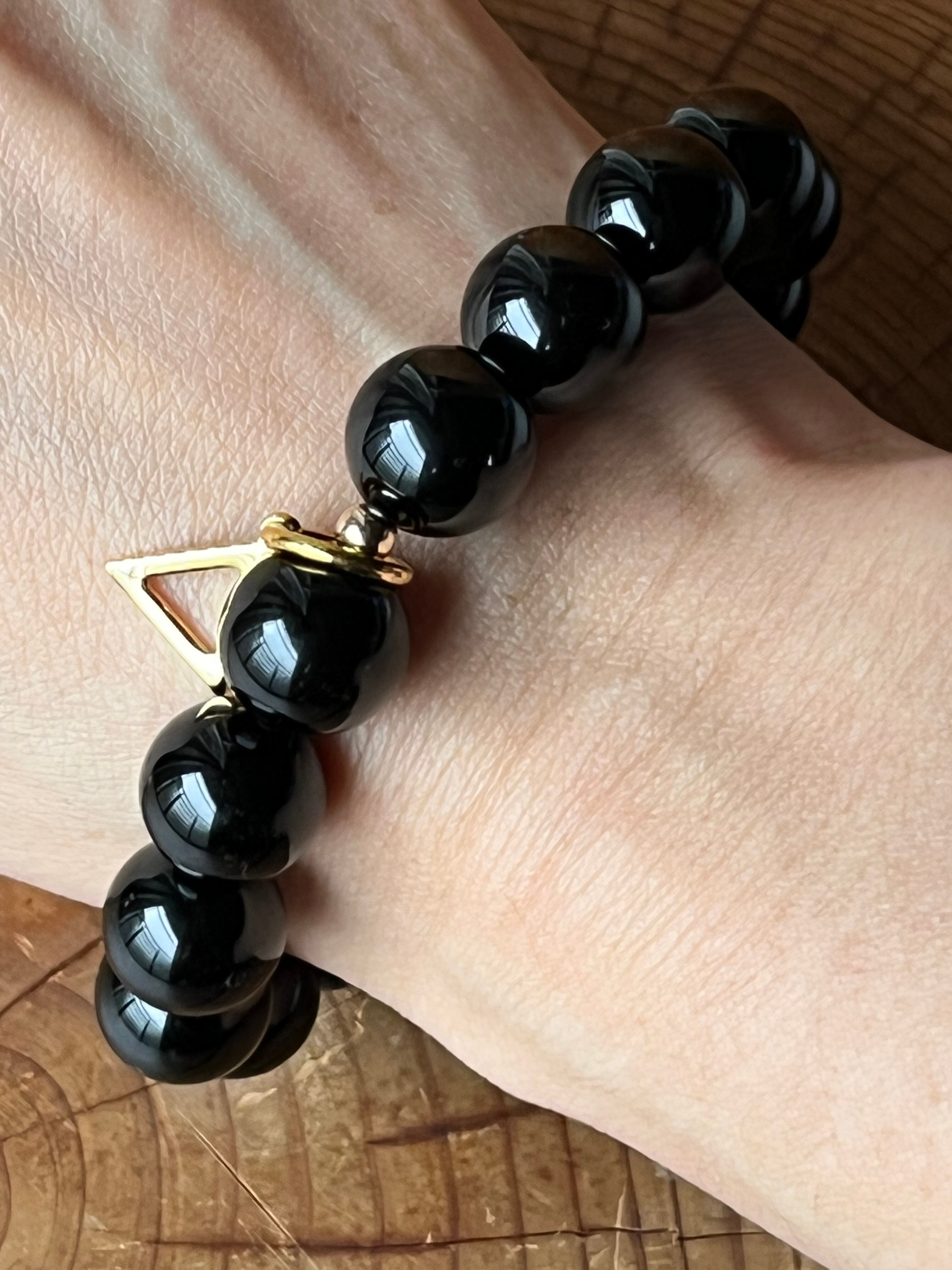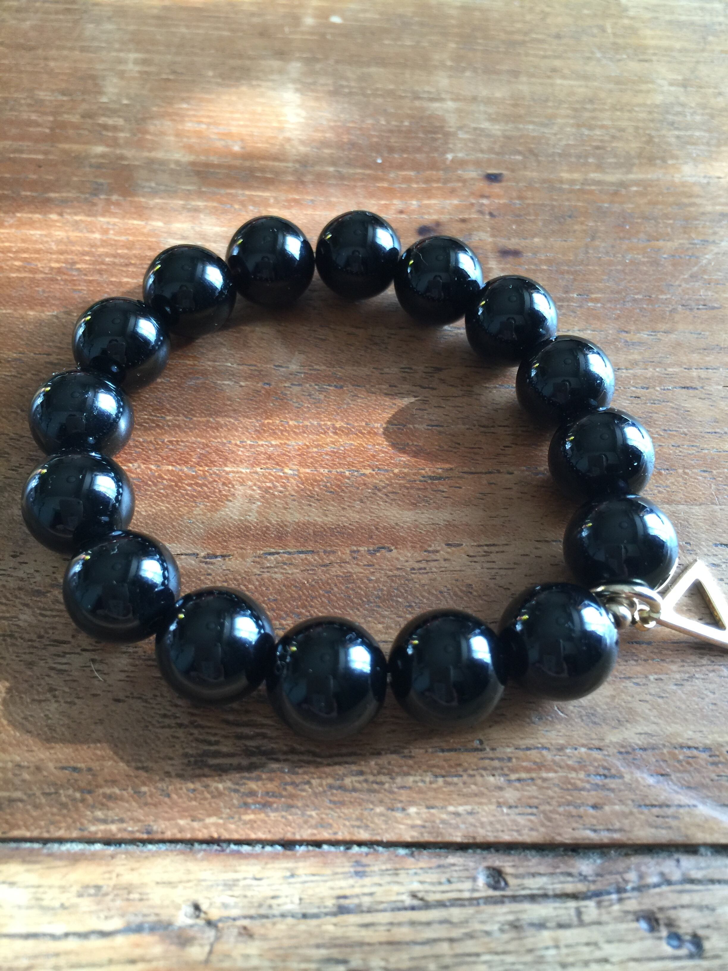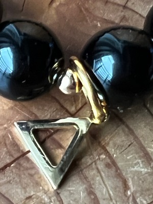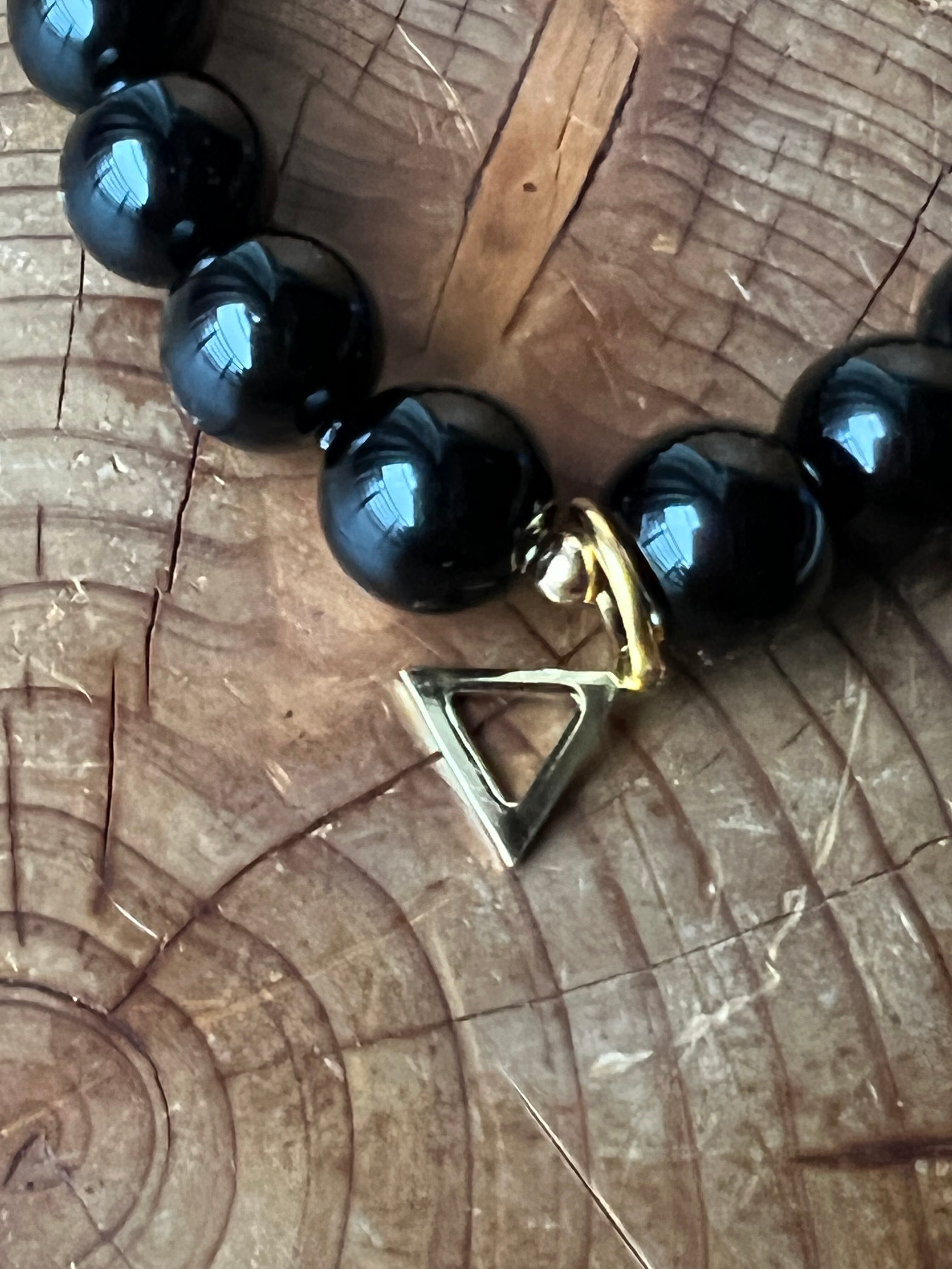 ショップの象徴であるトライアングルのチャームがついたこのチベット産のモリオン12mmブレスレットは